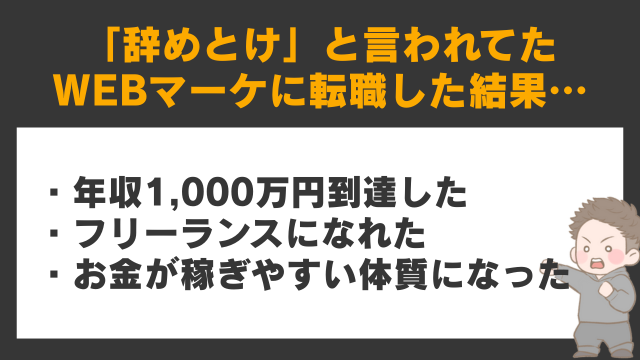 自分が26歳で初めて転職しようとした時は「WEBマーケティングなんて辞めておけ」っていう言葉がネット上でかなり乱立してました。